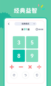 24点小游戏是一款既有趣又富有挑战性的益智游戏。它不仅能够锻炼大脑,还能增进亲子关系,成为休闲娱乐的好选择。赶快下载这款游戏,和朋友们一起挑战吧!相信你一定会爱上它的!