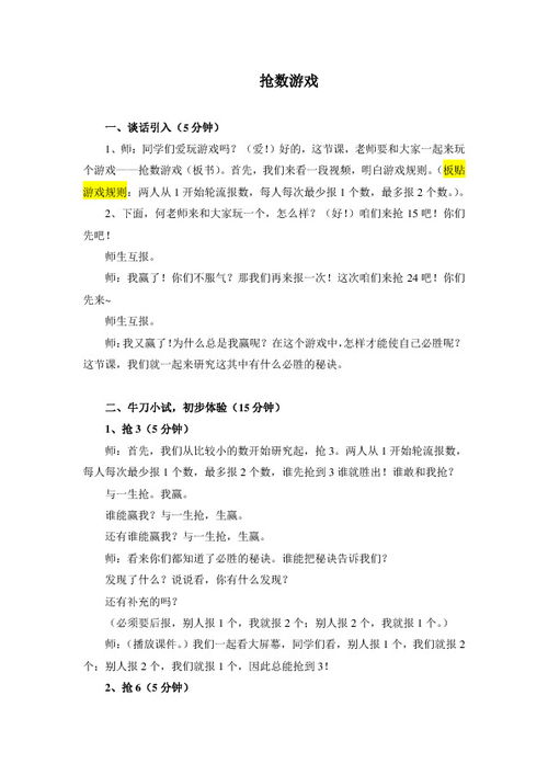 抢数字游戏教案,不仅是一堂有趣的数学课,更是一次充满挑战和乐趣的学习之旅。让我们一起走进这个数字狂欢的世界,见证孩子们的成长与进步吧!